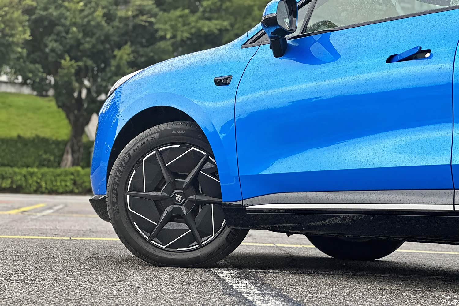 20英寸的双色半封闭式轮毂造型十分运动,轮胎使用的是米其林e聆悦,尺寸为245/50 R20。