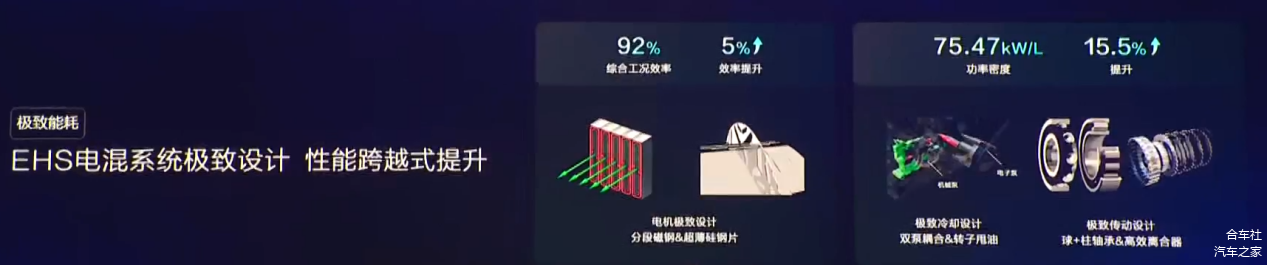 像控制发动机、电机工作的EHS电混系统,比亚迪就通过“球+柱”轴承、高效离合器、低粘度润滑油、电机超薄硅钢片等技术,把能量流动路径的损耗进一步降低,使得系统的效率从87.6%提升至92%,功率密度从65kW/L提升至75kW/L。