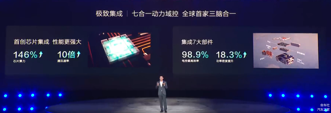 再来就是把软件控制策略升级得更高效。新的七合一动力域控,把电压控制单元、双电机控制单元、直流升压模块、车载充电机、直流转换器、电源分配单元等七个部件深度集成,既减少了动力域控体积,也大大缩短通信路径。使得启停、发动机工况点更高效,为节能奠定更大基础。