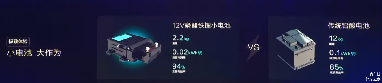 此外,被许多车企忽视的12V启动电池(笨重的铅酸型蓄电池,约12kg),也被比亚迪换成了磷酸铁锂电池。新的电池不仅更轻便(2.2kg),它的容量、充放电性能寿命、都变得更强,并且因为不含重金属铅,所以也更加环保。