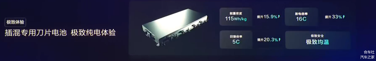 而辅助供能的插混专用功率型刀片电池,通过成组效率优化,把电池能量密度提升了15.9%(较上代),换句话说就是更小更轻的新电池,能给出和更大更重的旧电池一样的能量来。另外放电倍率它也提升到16C,回馈功率增强到5C,电池轻了,并且能更快放电,回电,节能效果自然变得更好。