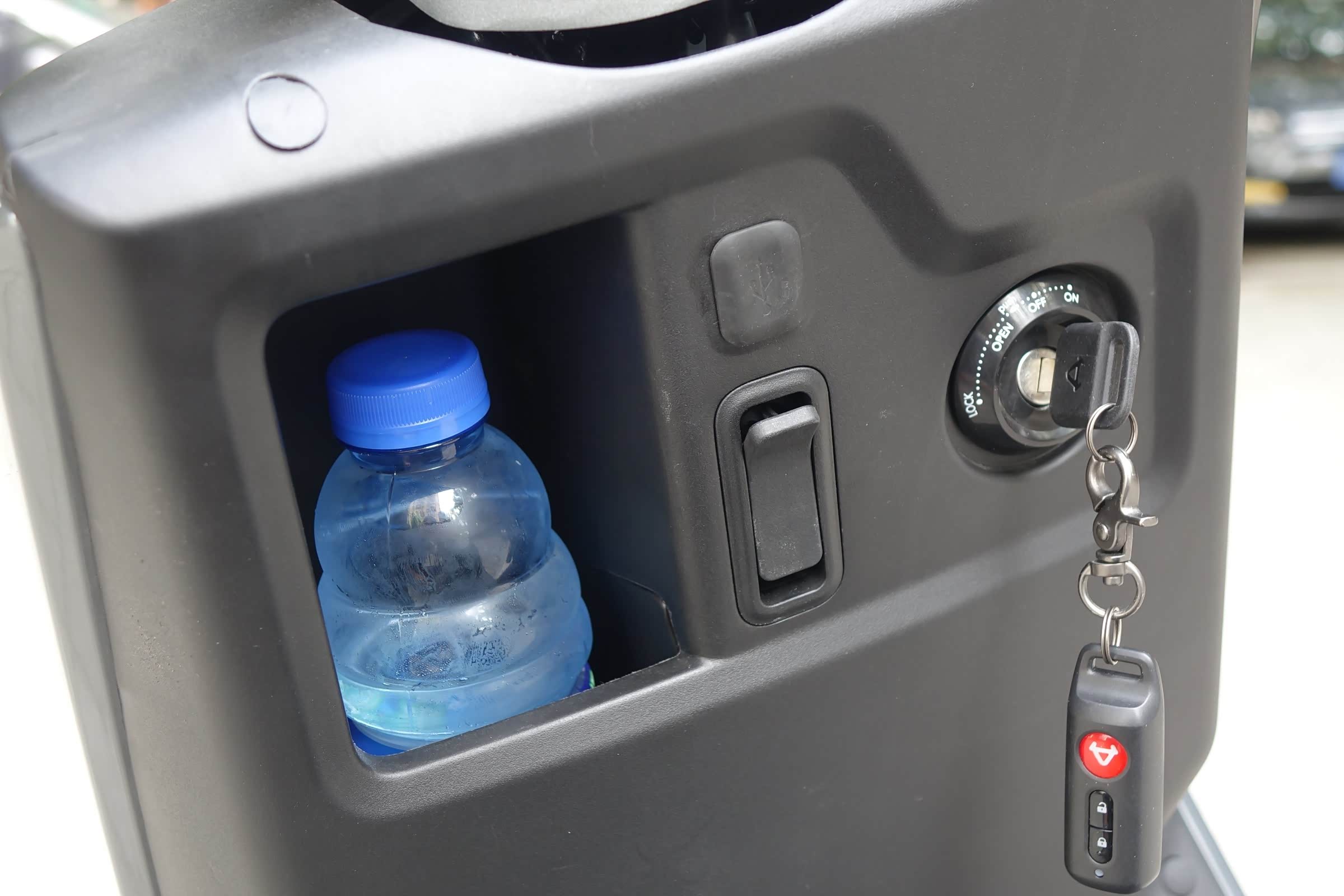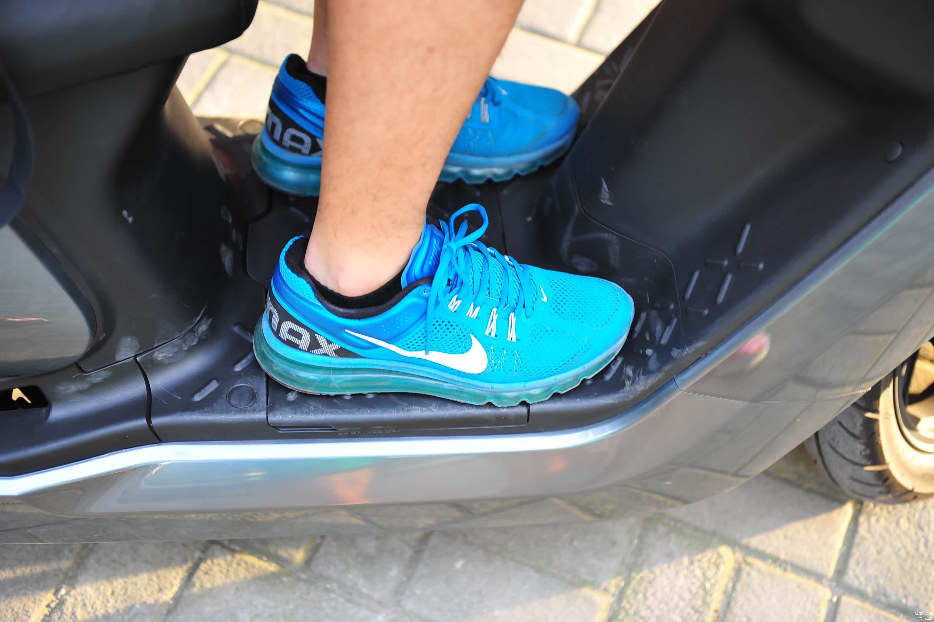 而N1S就宽裕太多了,不仅前面有一个不小的储物格,什么矿泉水、手机、烟之类的东西通通都可以放里面。而且由于车身体型比M1大了不少,脚踏板的地方也很充裕,电池也就不用和座椅下面抢空间了。