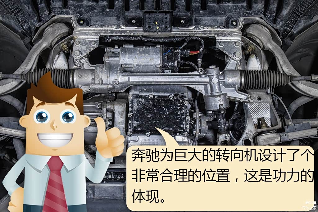 这是前铝合金的副车架,前后左右都是极度对称的效果,很漂亮。另外,现时的可变阻尼式转向系统非常巨大,奔驰就为转向系统专门设计了副车架,从而保证车内的空间,反面例子就是君越,由于转向系统巨大,不得不牺牲一部分乘坐空间给发动机舱,所以此设计堪称完美,功能性与美观都满足了。