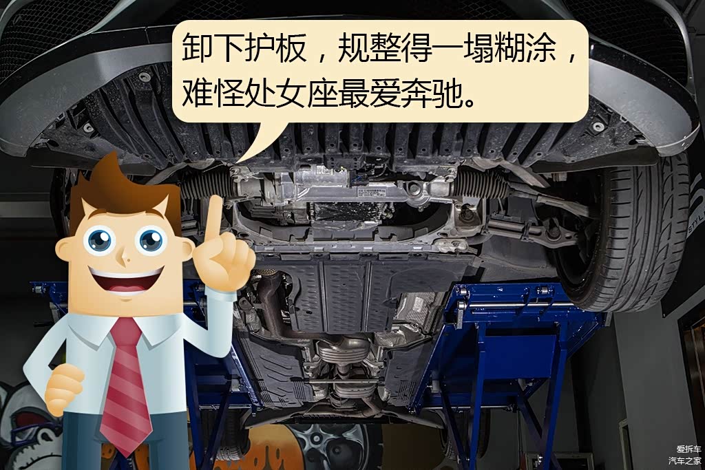 前副车架的位置有一块护板,通常拆车君将它卸下后,所有的不规整都展现出来,除了奔驰,C级在奔驰中算是有历史的车型,但并非主力,底盘的设计依然下足功夫,整齐程度居然可以跟我军的被子一样。