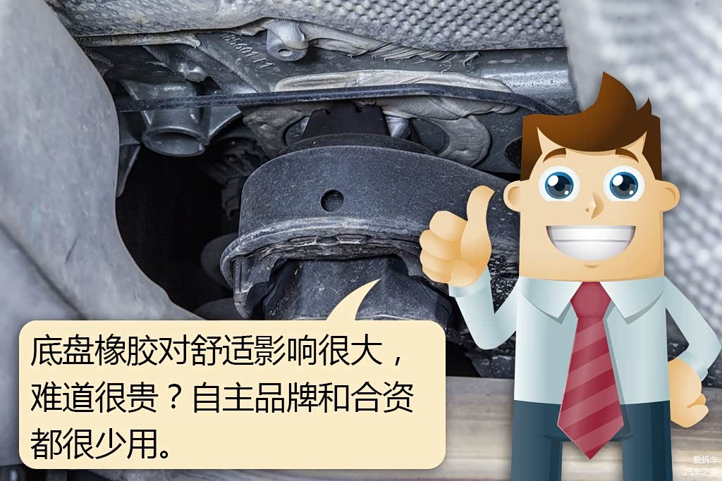 前后副车架与车身连接是底盘舒适的重点,无论合资还是自主品牌,副车架连接车身大多硬连接,震动、噪音都很容易传入车内,对车底做了多少隔音也抵不过块橡胶,如果大家不能感受到的话,拆车君可以更直接地告诉你,08款的老轩逸与新轩逸其实没有任何改变,就是橡胶不同,底盘的舒适性与厚实感就不同了。