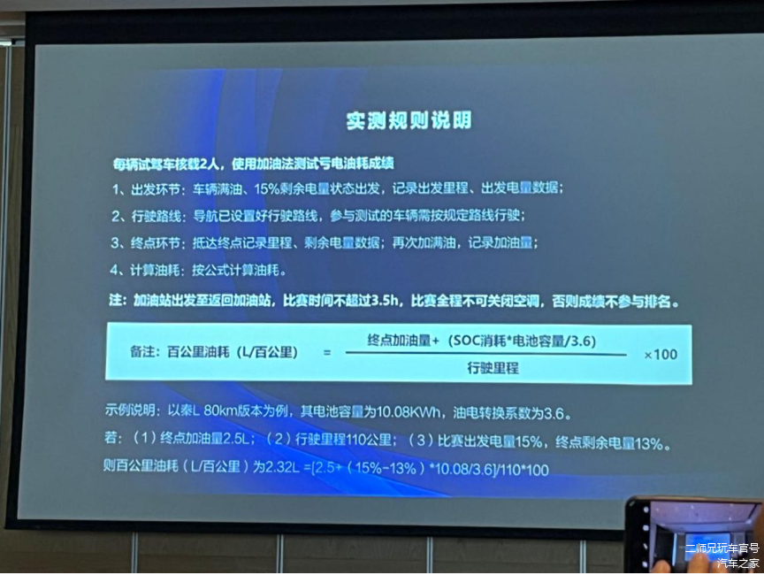关于最终成绩的计算,套用的公式是:百公里油耗(L/100km)=[终点加油量+(SOC消耗×电池容量/3.6)] /行驶里程×100。