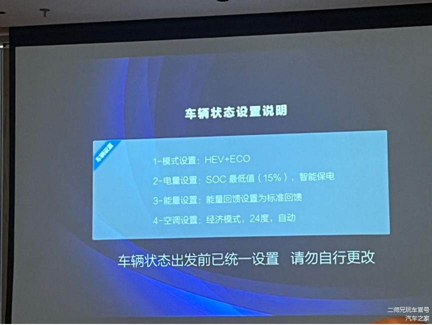 这儿有2个重点,一是能量回收是“标准”模式,而不是“强”;二是空调室设置“24度”+”Auto”模式,开过纯电动车的人对于这2项设置对于能耗的影响应该有一些概念。