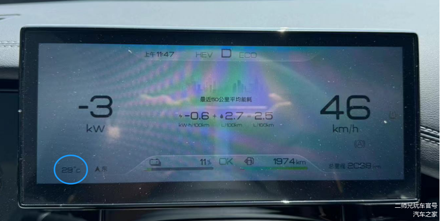 在此也补充一个与能耗息息相关的信息,当天车外环境温度高达29度,也就意味着空调的能耗不会低。