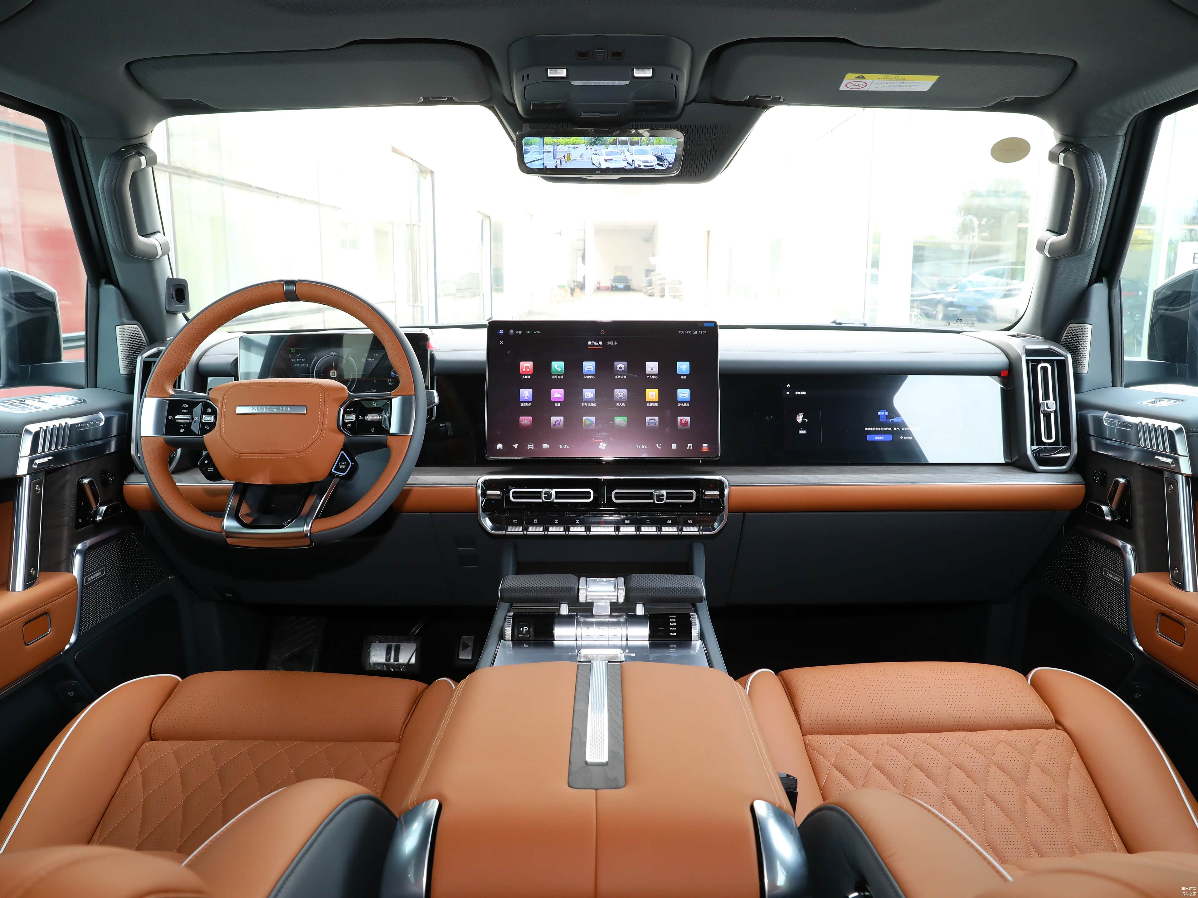猛士917的内饰设计注重科技与豪华并存。厚重大气的台面布局,双拼色软性面料包裹,带来丰富的视觉层次感。中央配备大尺寸悬浮屏,副驾一侧亦设内嵌式娱乐屏。挡把设计灵感源自飞机推杆,按键布局有序,尽显前卫风范。