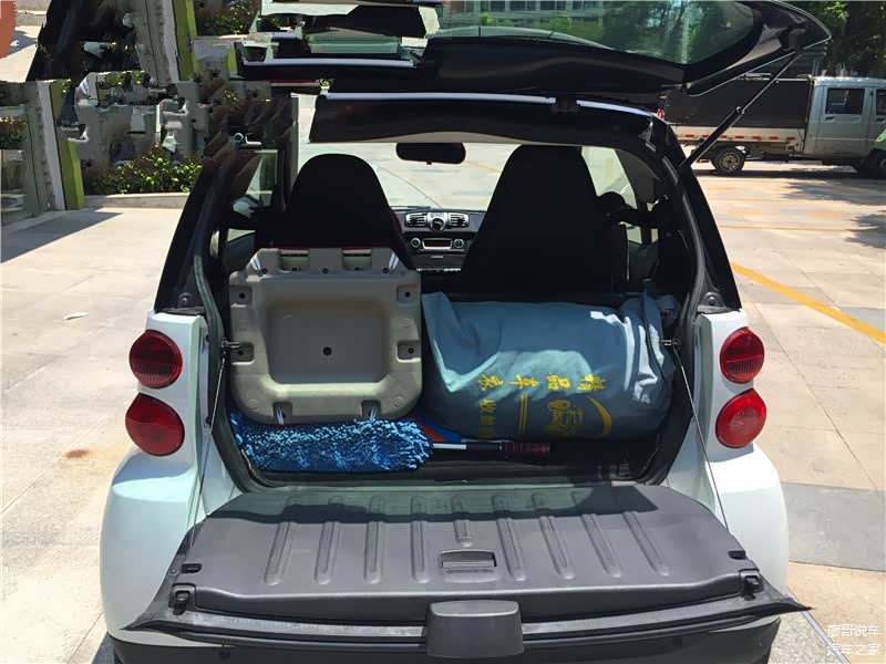 smart fortwo虽然车身比qq短了1米,但高度和宽度都比qq大。所以从尾部看去smart fortwo还是蛮敦实的。