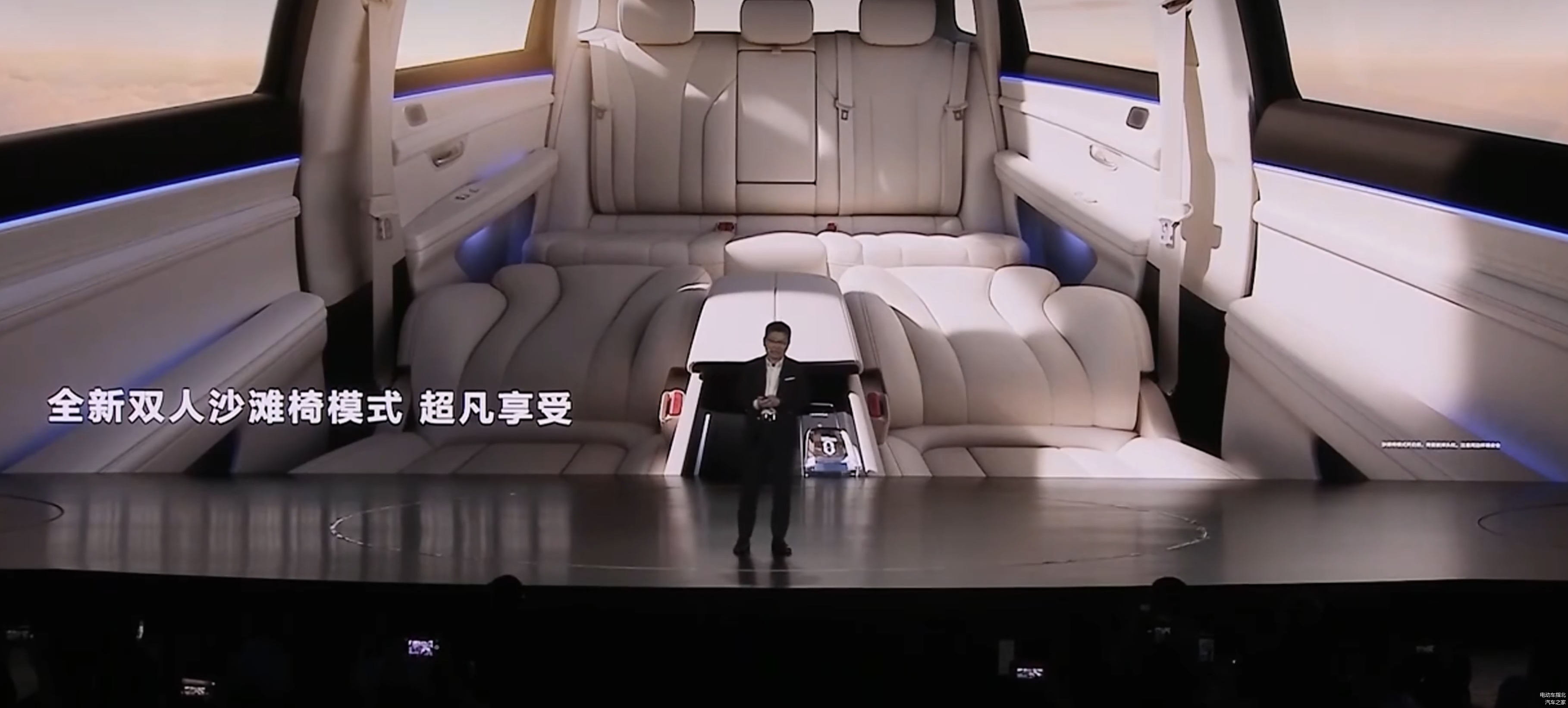 座椅方面一二排标配 Napp 真皮,前排座椅支持 12 向电动调节、座椅记忆(主驾)、通风、加热和按摩,二排同样支持通风、加热和按摩;其中五座版二排支持 27°-37°的角度电动调节,六座版二排右侧有零重力座椅。