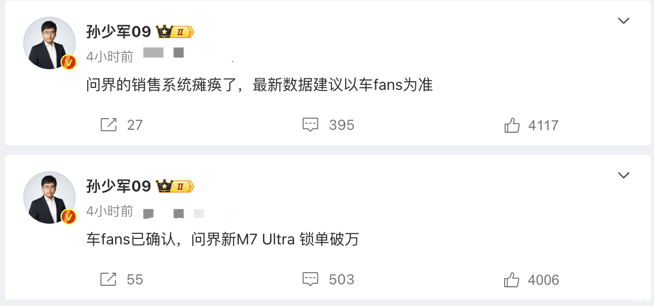 最后这次问界新M7 Ultra版发布后不久,很多老车主都喊被“背刺了”,质问华为不给老车主补偿。根据车fans创始人孙少军的统计,发布会结束2小时,问界新M7 Ultra锁单就破万了。