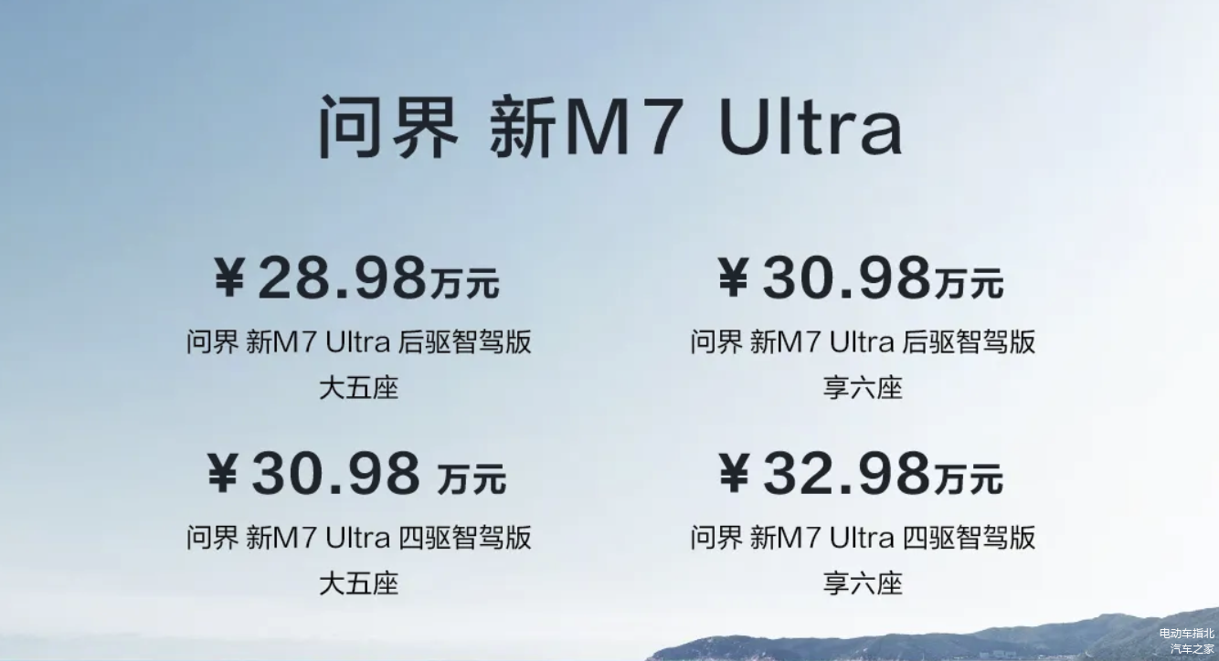 5 月 31 日,问界新 M7 Ultra 正式上市,共推出 4 款车型,售价区间为 28.98-32.98 万元。