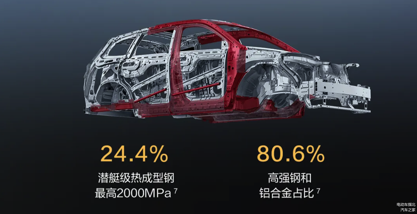 安全:新车标配 8 气囊,包括主副驾驶位气囊,前后排侧气囊以及侧气帘。新车的高强度钢和铝合金占比达到 80.6%,热成型钢的比例达到 24.4%,最高 2000MPa;主动安全方面,新车的前 AEB 最大生效时速达到 4km/h-150km/h;同时支持侧向和后方的 AEB 功能。