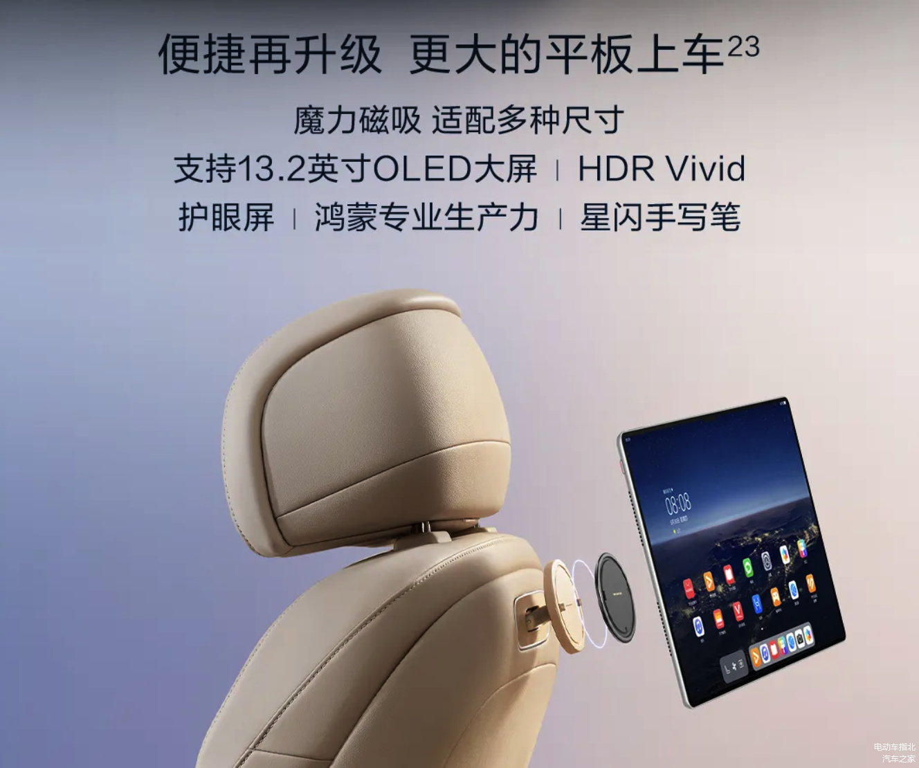 座舱:新车搭载 10.25 英寸的仪表和 15.6 英寸的中控屏,同时后排有平板接口(平板要自己买)。标配有 128 色的氛围灯、HUD 抬头显示、香氛系统、手机无线充电(双 50W)、水晶档把、电动遮阳帘、19 个车内扬声器和 2 个车外扬声器。