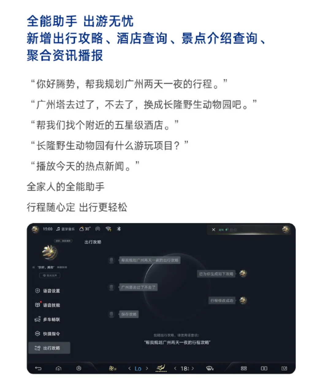升级之后的全新腾势N7,已经能够听懂人类语言,在车机系统上以语音预定一天的出行行程,也能轻松搞定。