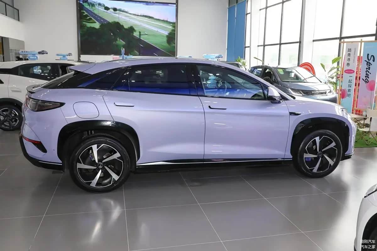 侧面线条流畅,车身勾勒出大溜背设计,再加上黑色车窗和A、B、C柱的融合,使得车体的悬浮感更强。隐藏式门把手也没有缺席,除入门级车型外,均配备了座椅迎宾和迎宾灯效功能,增加了入车的仪式感。车尾部分以大面积留白为主,5毫米的极窄线性灯带与水滴形点阵灯光相互呼应,巧妙地丰富了尾部内容。