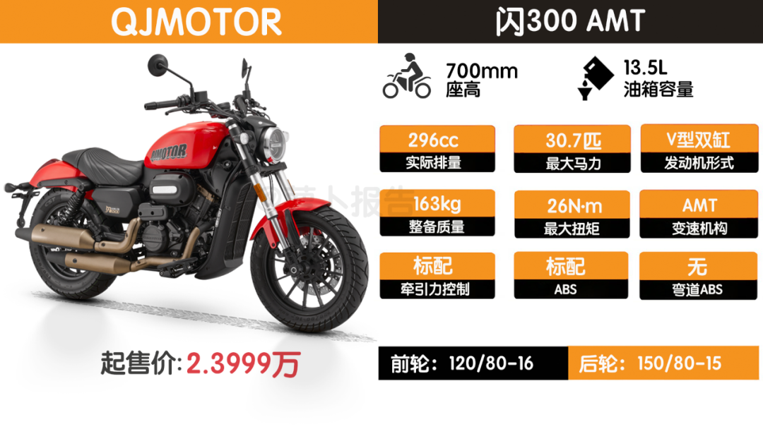 但这个无离合换挡就打破了限制,目前对于自动挡车型已经有很多厂家在研发。此次北京国际摩展上QJMOTOR的闪300AMT和长城8缸灵魂都是此类车型,完全符合通行标准。