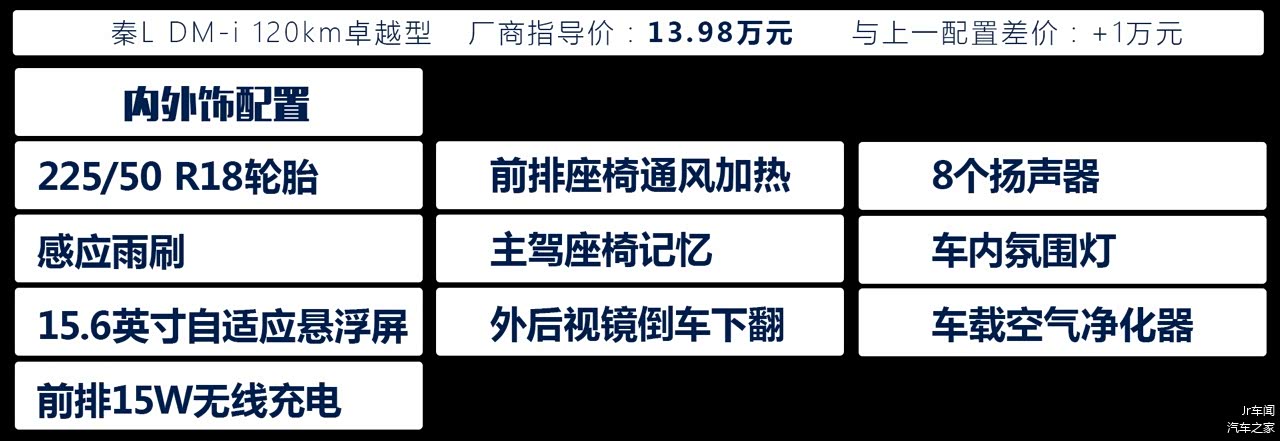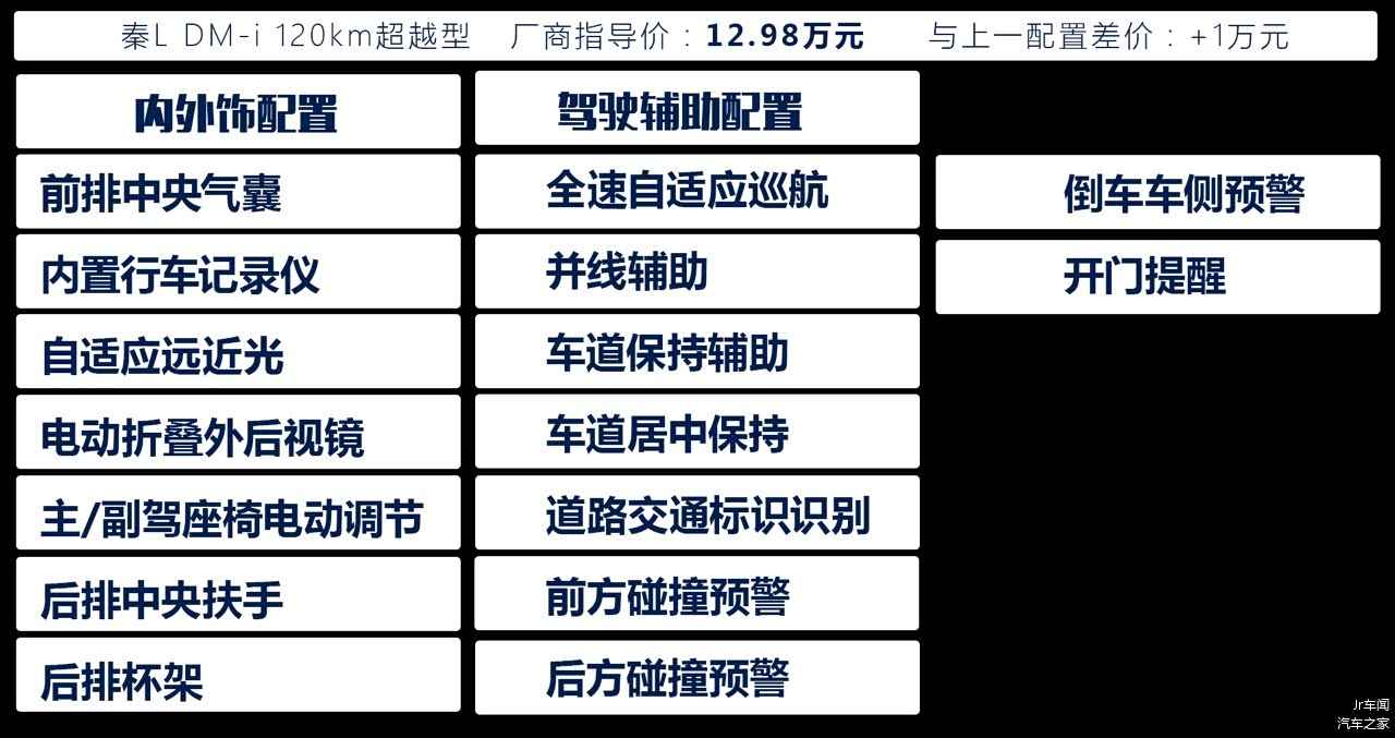 较之于上一个配置,秦L DM-i 120km超越型的售价又增加了一万元,虽然动力及纯电续航都没有变化,但在驾驶辅助以及安全性方面都有比较显著的提升,同时还增加了一些实用性配置,花一万元换来这些提升,我认为是物超所值的。更重要的是,结合它的综合表现和价格来分析,我认为它是秦L车系里最值得推荐的车型。