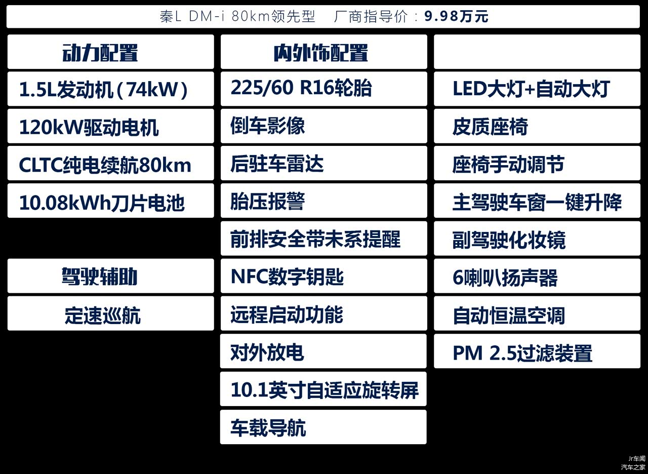 在最低配的基础上加一万元往上选,可以购买到秦L DM-i 80km超越型,虽然动力和纯电续航跟最低配一样,但它相对增加了不少实用型的配置,同时部分配置也得升级,多花一万元换来这些提升是物有所值的,说得直白一点就是用车的幸福感会有一定的提升,因此我认为它的推荐度会相对最低配要高一些。
