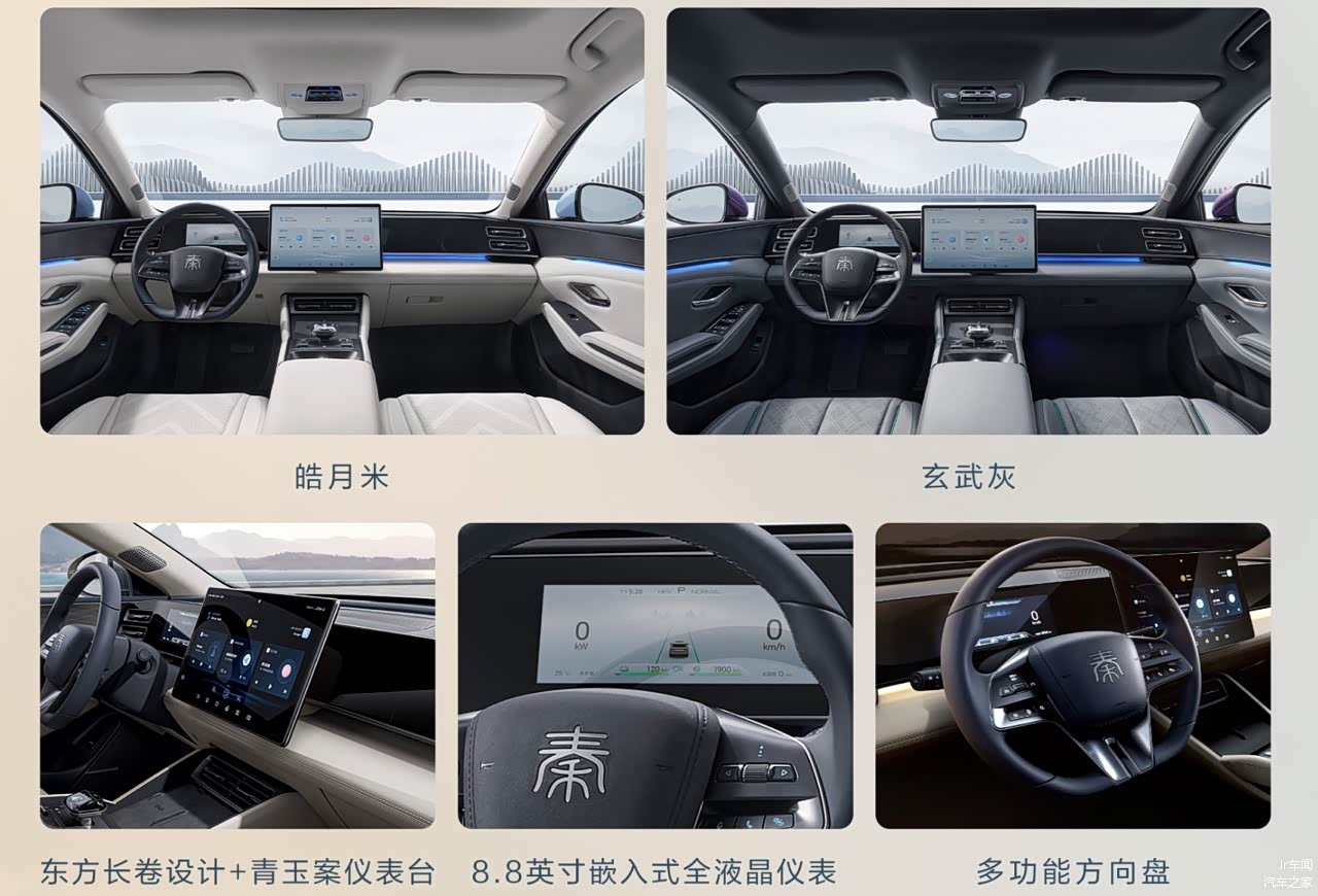 相比之下,内饰的设计稍微差点意思,车内依旧是满满的比亚迪味儿,过于规矩的中控台造型、内嵌式液晶仪表盘、县浮式超大尺寸的中控大屏……都已经是耳熟能详的设计。虽然这样的设计足够简洁,也比较顺眼协调,但也确实缺乏新鲜感。内饰配色有皓月米和玄武灰两种选择,都偏向于家庭温馨感的塑造。