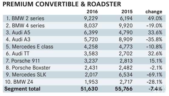 宝马2系第1。宝马4系第2。奥迪A5第3。奥迪A3第4。奔驰E级跑车第5。奥迪TT第6。奔驰SLK第9,宝马Z4第10。(奥迪3款,奔驰2款,宝马3款)