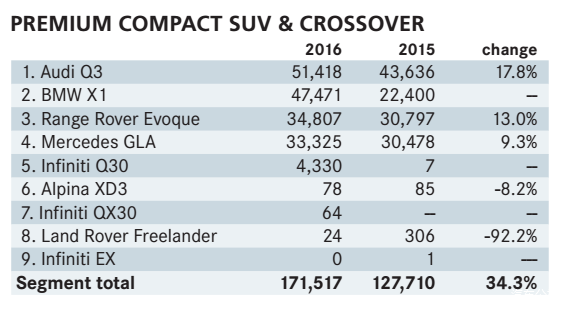 整体而言,奥迪覆盖细分市场最全面,包括A0级轿车和小众超跑,这些都是宝马和奔驰没有涉足的地带。但在某些细分市场,奥迪产品数量较为单一,即便个别产品拿下细分市场头名,但整个品牌在该细分市场却因为车型数量较少而弱于宝马和奔驰;例如紧凑豪华车,尽管奥迪A3夺冠,但前十名车型中只有这一款奥迪产品,宝马和奔驰各有3款车进入十强,因此比拼旗下紧凑车销量,奥迪输给了宝马奔驰。
