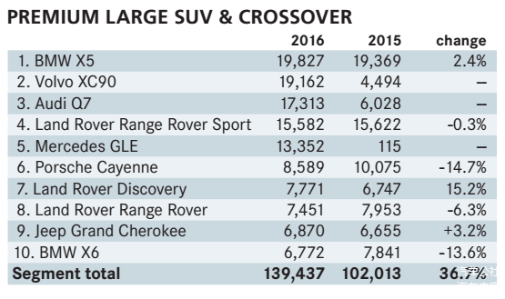 宝马X5第1。奥迪Q7第2。奔驰GLE第5。宝马X6第10。(奥迪1款,奔驰1款,宝马2款)