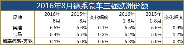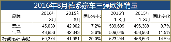 欧洲汽车制造商协会ACEA(Association des Constructeurs Européens d'Automobiles)发布的最新数据延续了“欧罗巴复苏”的兴奋:8月份,欧盟28国(实际上为不含马耳他的27国)乘用车新车销量同比增长10.0%至819,126辆,前8月累计销量同比攀升8.1%至9,787,760辆。而BBA为代表的豪华车则保持了“增速高于整体市场”的一贯势头。