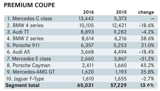 奔驰C级轿跑第1。宝马4系第2。奥迪TT第3。宝马2系第4。奥迪A5第6。奔驰E级轿跑第7。梅赛德斯-AMG GT第9。(奥迪2款,奔驰3款,宝马2款)