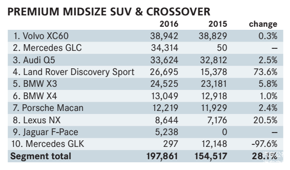 奔驰GLC第2。奥迪Q5第3。宝马X3第5。宝马X4第6。奔驰GLK第10。(奥迪1款,奔驰2款,宝马2款)