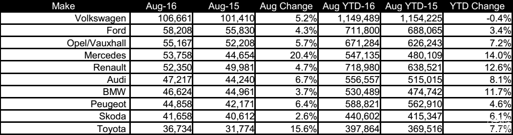 根据JATO Dynamics公司的排位,欧洲市场中,8月份奔驰在各大汽车品牌里销量排第4位,仅次于大众、福特和欧宝/沃克斯豪尔,甚至高于雷诺。奥迪和宝马则分别排第6和第7位。