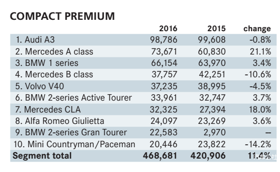 奥迪A3第1。奔驰A级第2。宝马1系第3。奔驰B级第4。宝马2系第6。奔驰CLA第7。宝马2系Gran Tourer第9。(奥迪1款,奔驰3款,宝马3款)