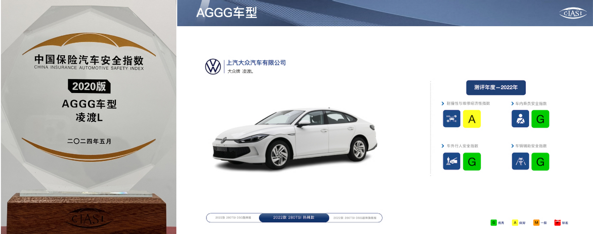 在近日备受瞩目的中国保险汽车安全指数(C-IASI)2020版总结会上, 上汽大众凌渡(图片 | 参数 | 询价)L以其卓越的安全性能脱颖而出,荣获AGGG车型,成为测评中的佼佼者。这一荣誉证明了凌渡L拥有“热辣”外观的同时,还具备“内外兼修”的综合高品质。