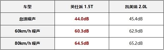 车型英仕派1.5T凯美瑞2.0L怠速噪声44.0dB45.4dB60km/h噪声60.3dB62.9dB80km/h噪声64.5dB65.2dB