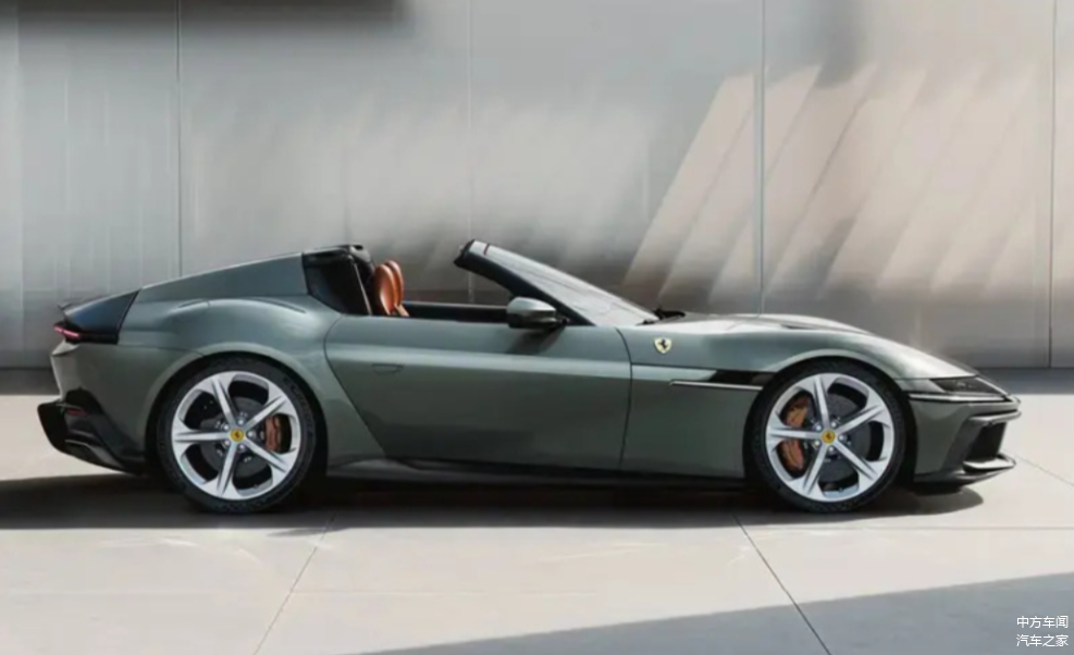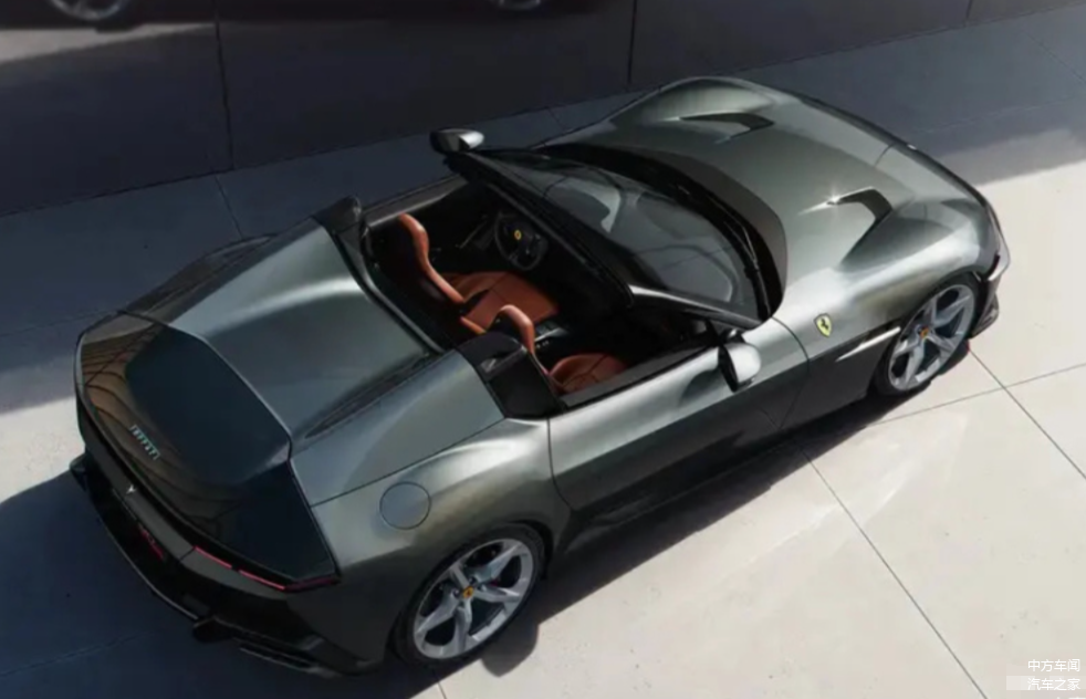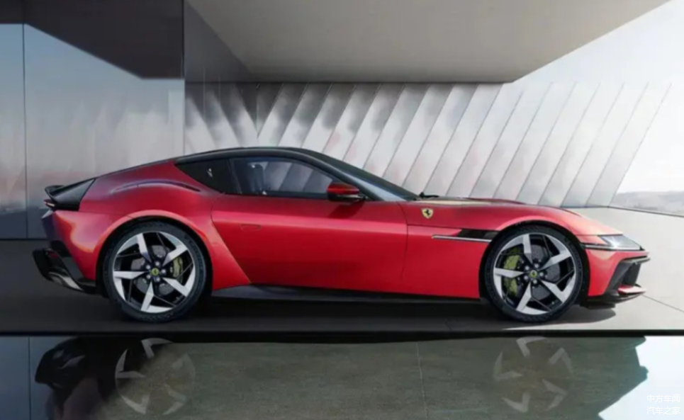 车身侧面,无论是硬顶版还是敞篷版,都采用了长车头+长前悬的设计,配合宽大的侧翼子板和21英寸轮圈,使得新车充满了强烈的运动感和俯冲的视觉效果。新车尺寸为4733/2176/1292mm,轴距为2700mm,相较于812车型,轴距缩短了20mm,但前后重量分配比仍为理想的48.4:51.6。