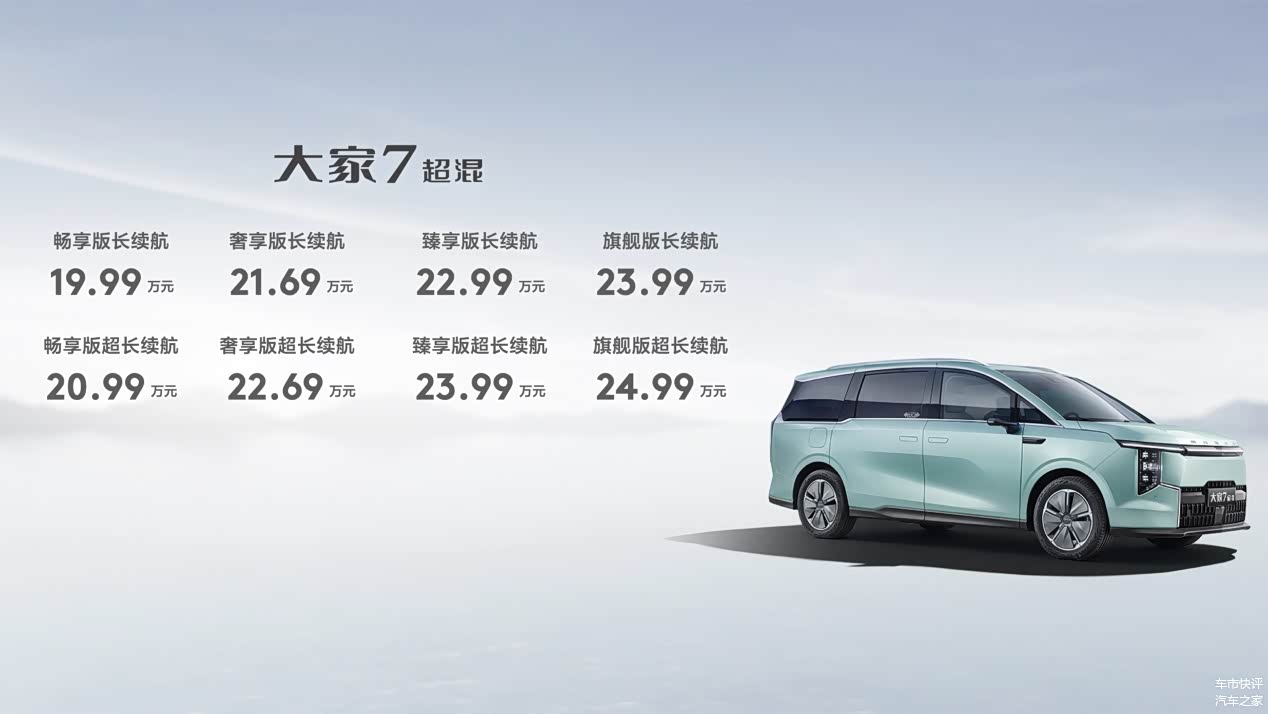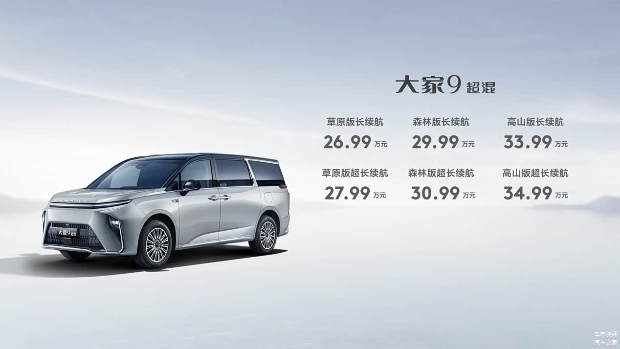 近日,上汽大通宣布,“超混双子星”大家9超混、大家7超混同步上市,大家9超混长续航版的售价从26.99万元起,而超长续航版则从27.99万元起;大家7超混长续航版的售价从19.99万元起,超长续航版则从20.99万元起。