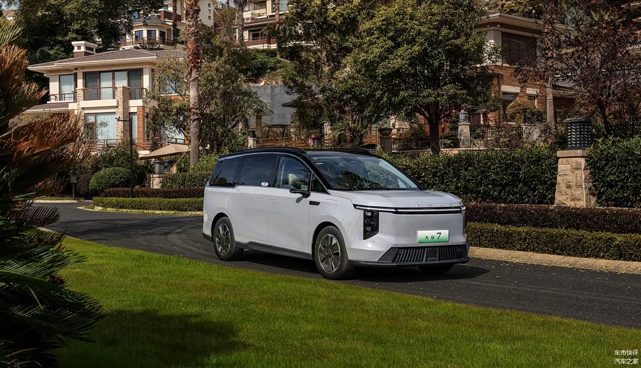 相较于大家9超混版,大家7超混版在外观设计上更加注重实用与时尚的结合。新车前脸部分变化显著,采用了更具辨识度的大灯造型和门形轮廓,使得整个前脸更加具有层次感。车身侧面延续了纯电动版的简洁设计,线条干练且富有力量感。尾部设计与前脸相呼应,尾灯采用了门形轮廓和熏黑风格灯罩,整体造型个性十足。
