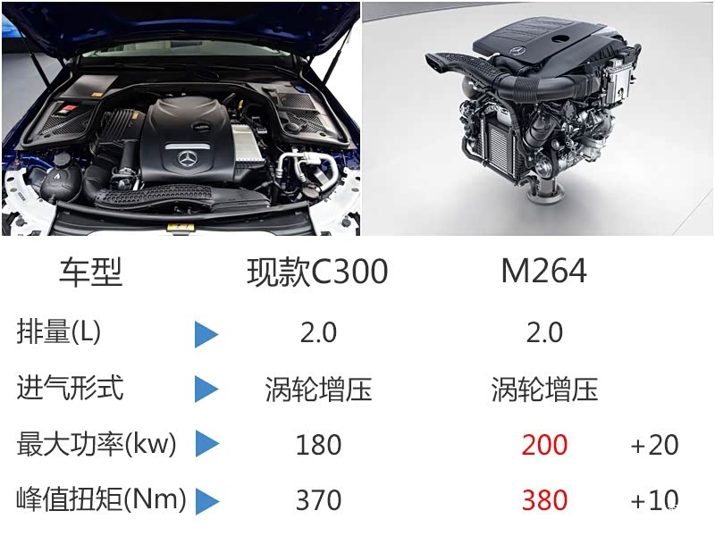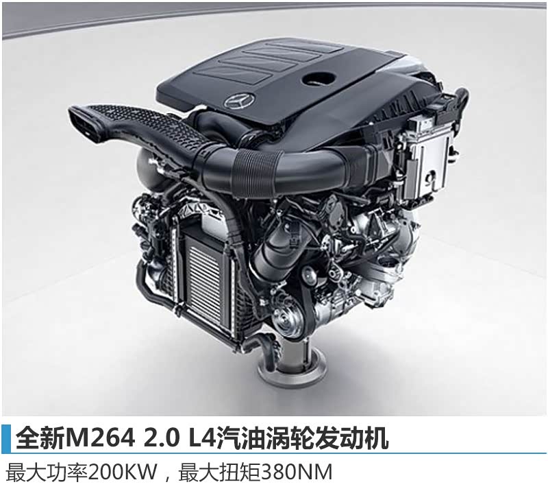 原厂代号M264的全新2.0升直列四缸涡轮发动机,采用的科技包含Twin-scroll双涡管涡轮、动能回收系统,以及48V的皮带驱动式启动马达,拥有更快的发动机启动速度,功率达到了200KW。作为国内市场黄金排量的2.0T,如果能够装配、将极大的提高奔驰车型在同级别的竞争力。