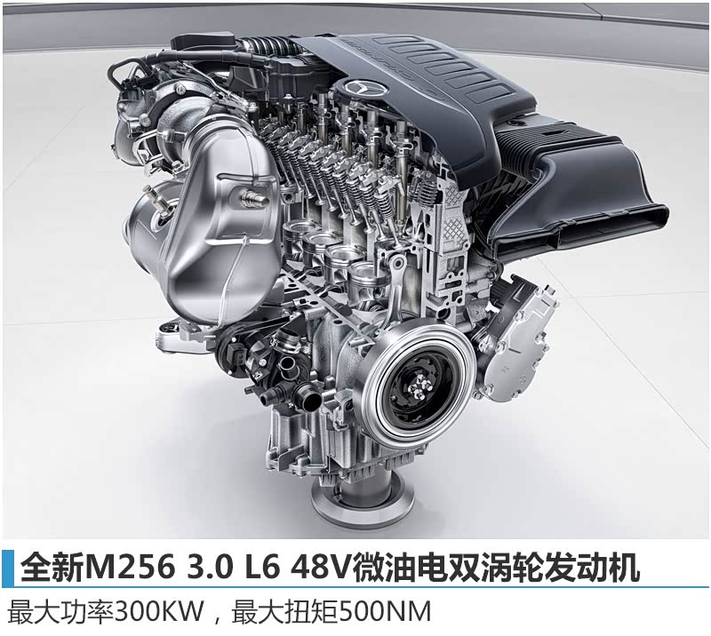 直列六缸一直都是宝马的拿手好戏,此次奔驰原厂代号M256,48V微油电直列六缸汽油涡轮发动机颇为抢眼。这具发动机最大的特色,在于具有48V的微油电动力技术,该发动机除了原本的12V电力系统之外,还加入了未来将成主流的48V电力系统,用来支援水泵、空调压缩机、ISG整合式启动马达,以及电子涡轮(用来改善涡轮迟滞)等装置。奔驰表示这具全新的直列六缸汽油双涡轮发动机,将拥有媲美八缸的性能,以及如同四缸发动机的油耗水准。