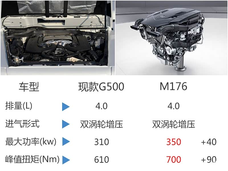 新发动机中最强劲的,是原厂代号M176的4.0升V8双涡轮增压发动机,取代目前搭载于S500上的4.7升V8双涡增压机体 (M278)。奔驰表示全新的M176,技术源自M178 (AMG GT) 及M177 (C63) 的4.0升V8双涡轮,改采双涡轮摆放在V型夹角内的设计,增进了5%的性能表现,预计可输出350KW的最大功率 ,并可从2,000转开始供应700NM的最大扭矩。同时配备了自动闭缸技术,节约能耗。(网上车市 2016年11月1日 北京报道)