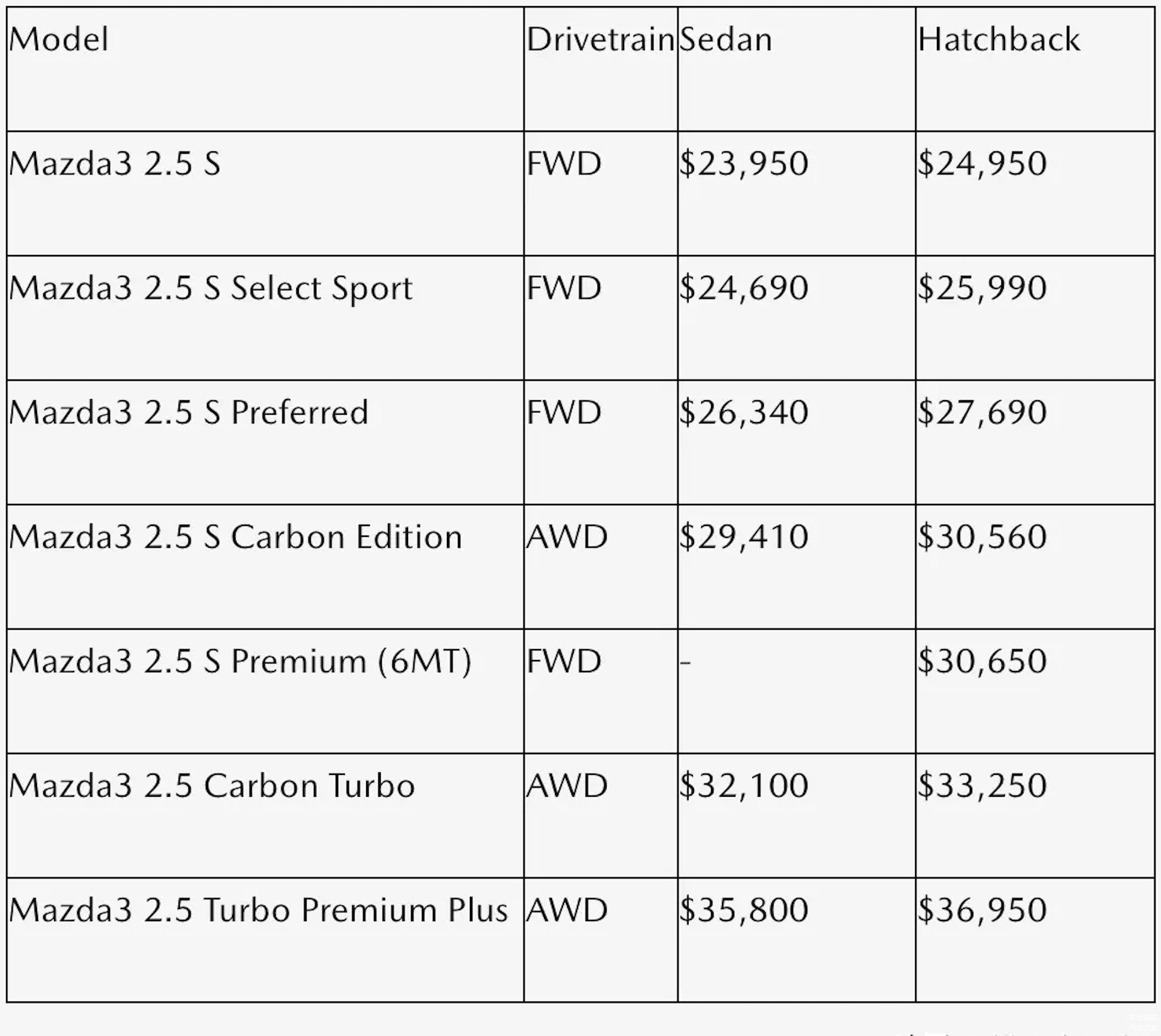 除此之外,2025款马自达3的购买门槛相比2024款车型有所下调,其中三厢版入门车型的指导价低了220美元;两厢掀背版在新增2.5S车型作为入门车型后,起售价格相比2024款入门车型的指导价低了740美元。