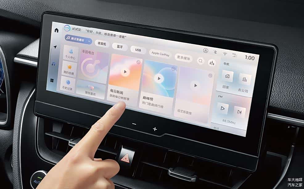 内饰方面,新款丰田卡罗拉锐放秉承家族化设计理念,部分车型车内用料实现更新,其中前门饰板运用软性材质包裹,并配备了皮质座椅。在此基础上,新款丰田卡罗拉锐放全系标配10.25英寸悬浮式中控屏,其中高配车型应用8155座舱芯片,而精英版及先锋版则搭载不带在线导航的系统,支持Carlife/Carplay/Hicar手机互联等功能。