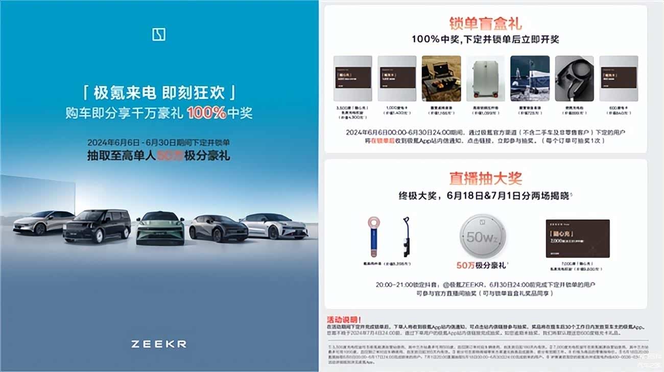 说起 极氪007(图片 | 参数 | 询价)的购车权益,那真是让人眼前一亮。在6月6日到6月30日这段时间里,下定并锁单极氪007的用户,可以参与一个有趣的盲盒抽奖活动。每个订单都有一次抽奖机会,奖品丰富多样,有3500度电卡、1000度电卡、露营桌椅套装等等,这些奖品加起来价值可不小呢。如果你不想挑战大奖,那么直接获得600度电卡也是个不错的选择,相当于直接便宜了840元,这可是实打实的优惠啊。