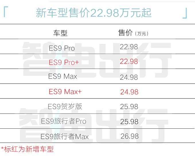 ES9 Pro+版增加AR-HUD抬头显示、后视镜倒车自动翻转、后视镜记忆、手机无线充电、自动防眩目内后视镜、全景电动天窗带电动遮阳帘、前门窗隔音玻璃、方向盘加热、前排高级真皮座椅、前排座椅硬质背板、前排座椅按摩、前排座椅通风、驾驶员座椅记忆、驾驶员座椅坐垫电动伸缩、驾驶座4向腰托、副驾驶座椅坐垫电动伸缩、副驾驶4向腰托、副驾驶座老板键、第二排高级真皮座椅、第二排座椅加热、第三排座椅电动放倒/还原。