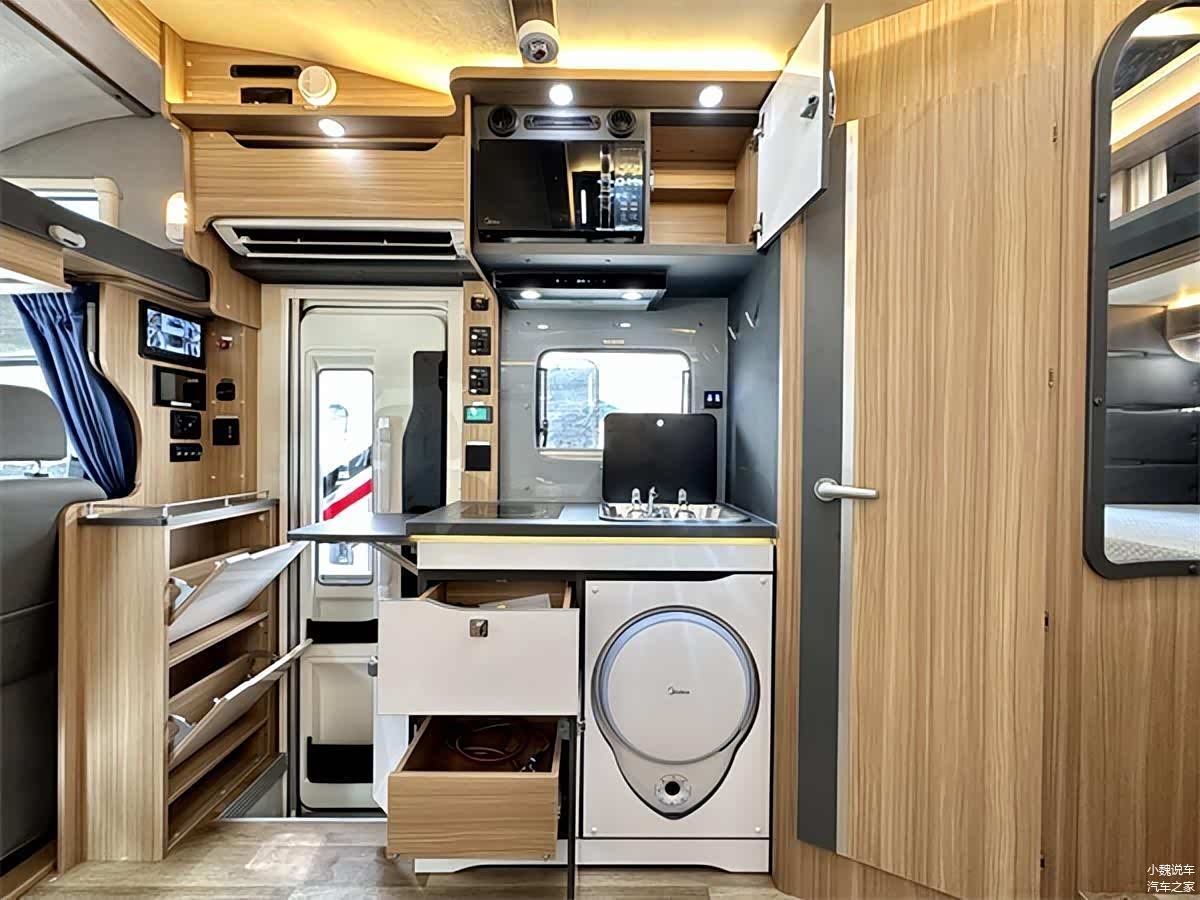 配备了房车专用遮阳篷、LED灯带、电动踏步、野餐桌、外挂野餐桌板、5公斤煤气罐仓+外抽拉燃气灶、六路监控摄像头、驻车支腿、电源充电口、水箱注水口、外置淋浴花洒、以及备胎悬挂、黑水箱马桶区、贯通式超大储物舱等一整套能露营、能野炊的设备,将极大地减少旅行中所带来的各种不便。
