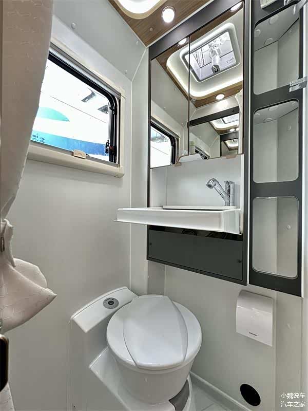 卫生间最大亮点有两个地方,第一是采用了欧式的折叠水槽设计,节约空间;第二则是玻璃镜面的储物柜门,增大视觉空间,其他的地方较为常规不再赘述。水路方面,标配净水箱210L+灰水箱60L。