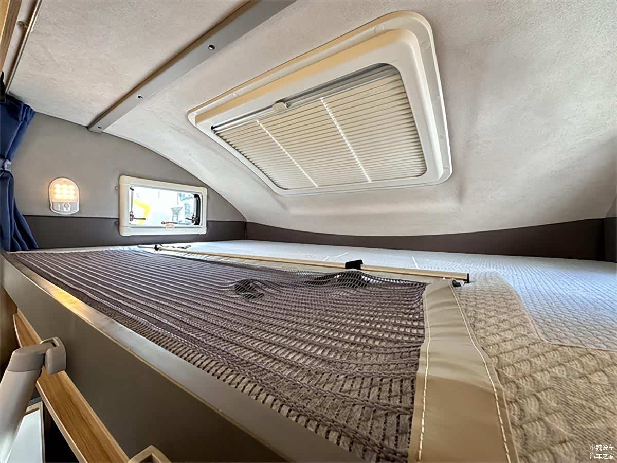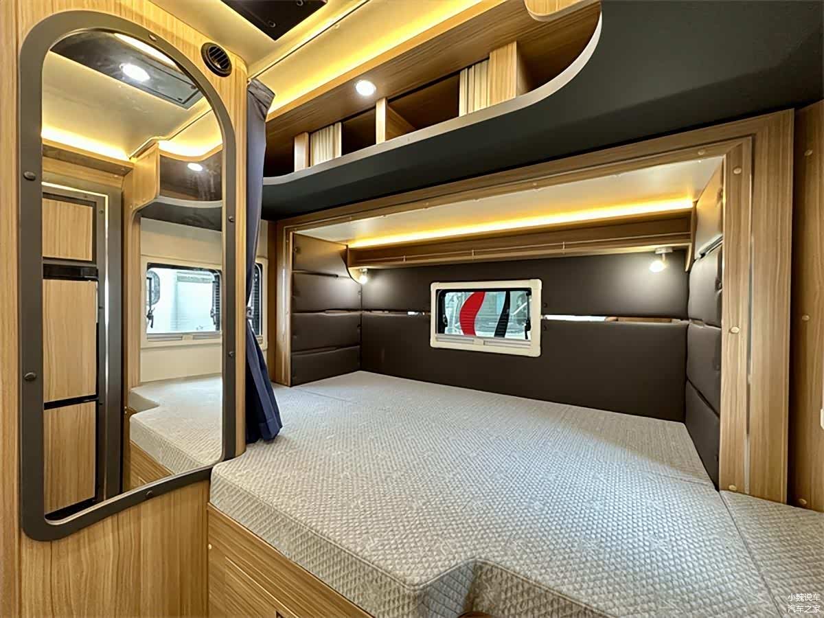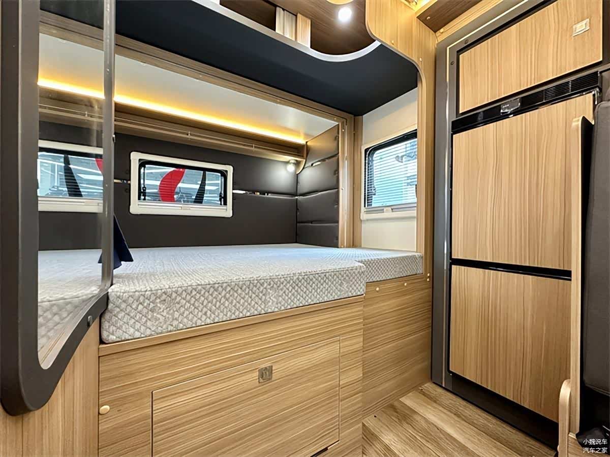 车尾拓展区设有横置双人床,床铺尺寸为2205*1400mm,整体以公寓式主卧风格设计,内部采用环保软包材质包覆,即使同样采用三面环窗的布局,在静谧效果上也能强出一筹。此外,床铺内还安装有阅读灯、220V电源插座、USB接口、隐私帘以及储物格等日常生活常用的实用设备。