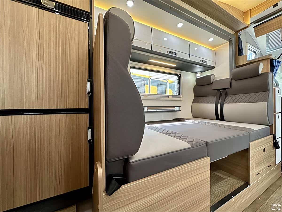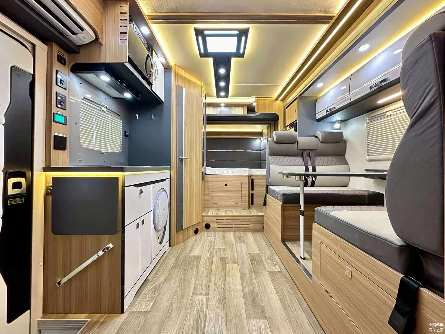 云游房车内部生活区在设计上可以说非常出色,以浅黄、商务黑加原木三种色彩搭配以及各种环保板材,所呈现出来的风格,与我们长看到过的高档装修或者高档公寓类似,既温馨又有品质,作为中端车型的云游房车,在内饰方面的表现相当出色!而在布局上,得益于双拓展机构所带来的额外空间属性,内部所配备的前后主卧加拓展客厅的生活空间会非常宽敞,而且搭配多扇天窗、通风换气窗,采光效果也得到了保障。
