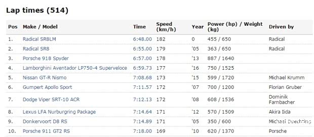 【纽北最速前十,Radical SR8霸占了冠亚军】
